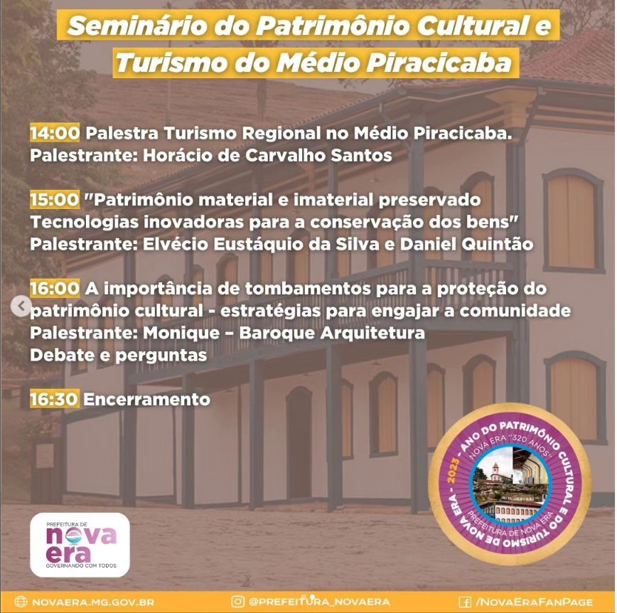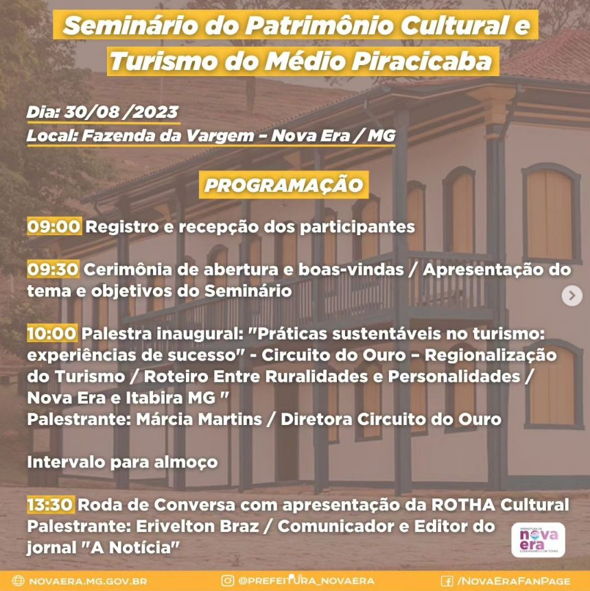 A Prefeitura Municipal de Nova Era convida você para o nosso Seminário de Turismo do Patrimônio Cultural e Turismo do Médio Piracicaba, um evento dedicado a explorar práticas e ideias inovadoras para impulsionar o turismo de maneira responsável e consciente. Junte-se a nós para uma jornada de aprendizado e inspiração!